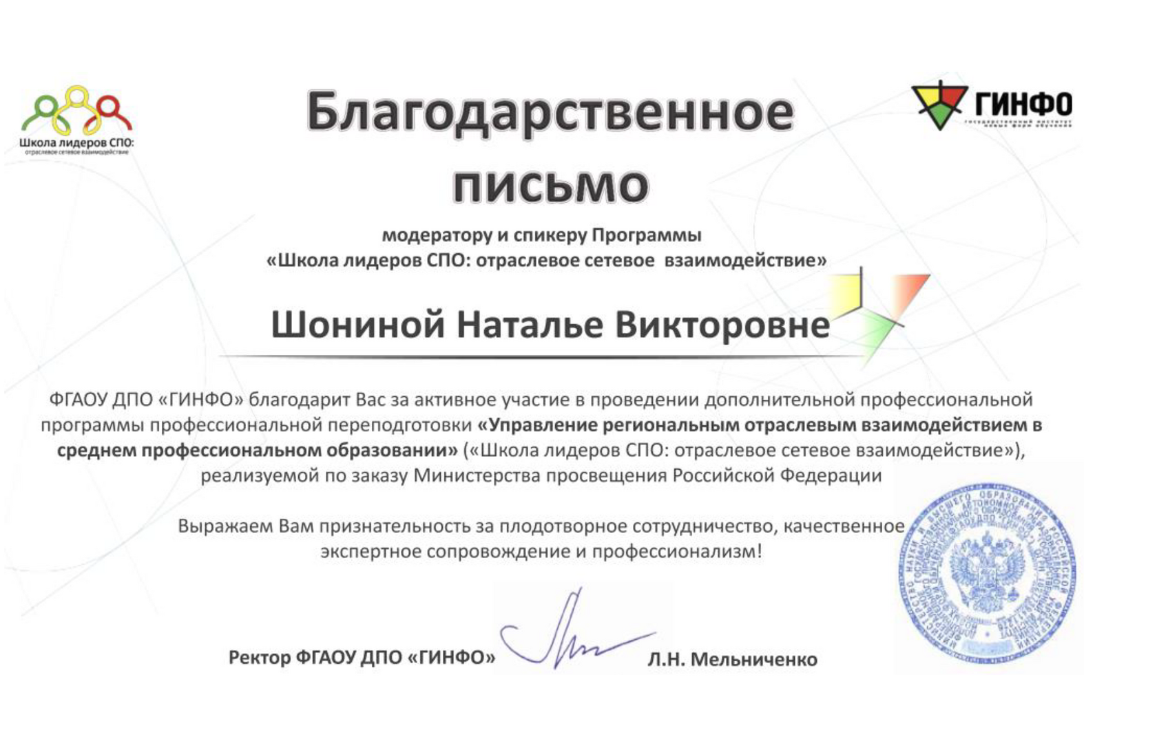 ФГАОУ ДПО «ГИНФО» благодарит вас за активное участие в проведении дополнительной профессиональной программы профессиональной переподготовки «Управление региональным отраслевым взаимодействием...