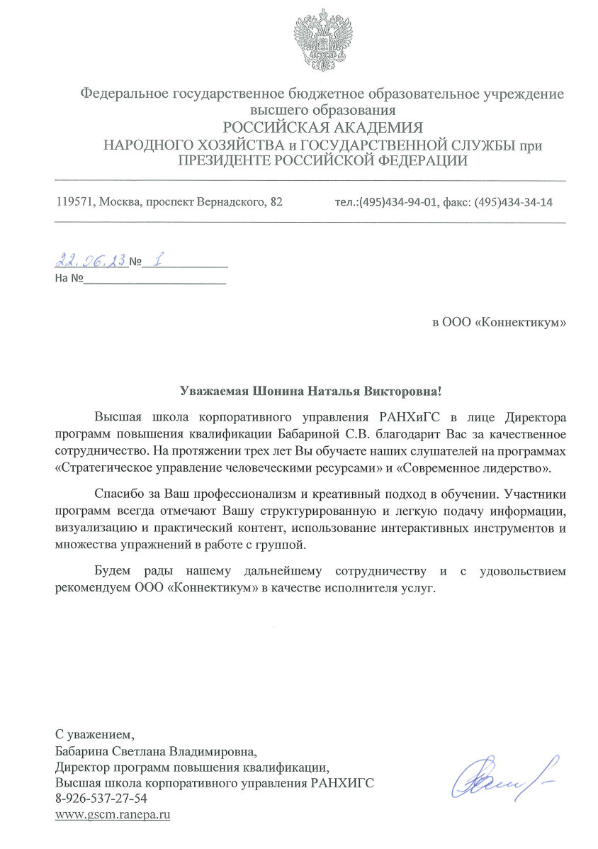 ВШКУ РАНХиГС в лице Директора программ повышения квалификации Бабариной С.В. благодарит Вас за качественное сотрудничество. На протяжении трех лет Вы обучаете наших слушателей на программах...
