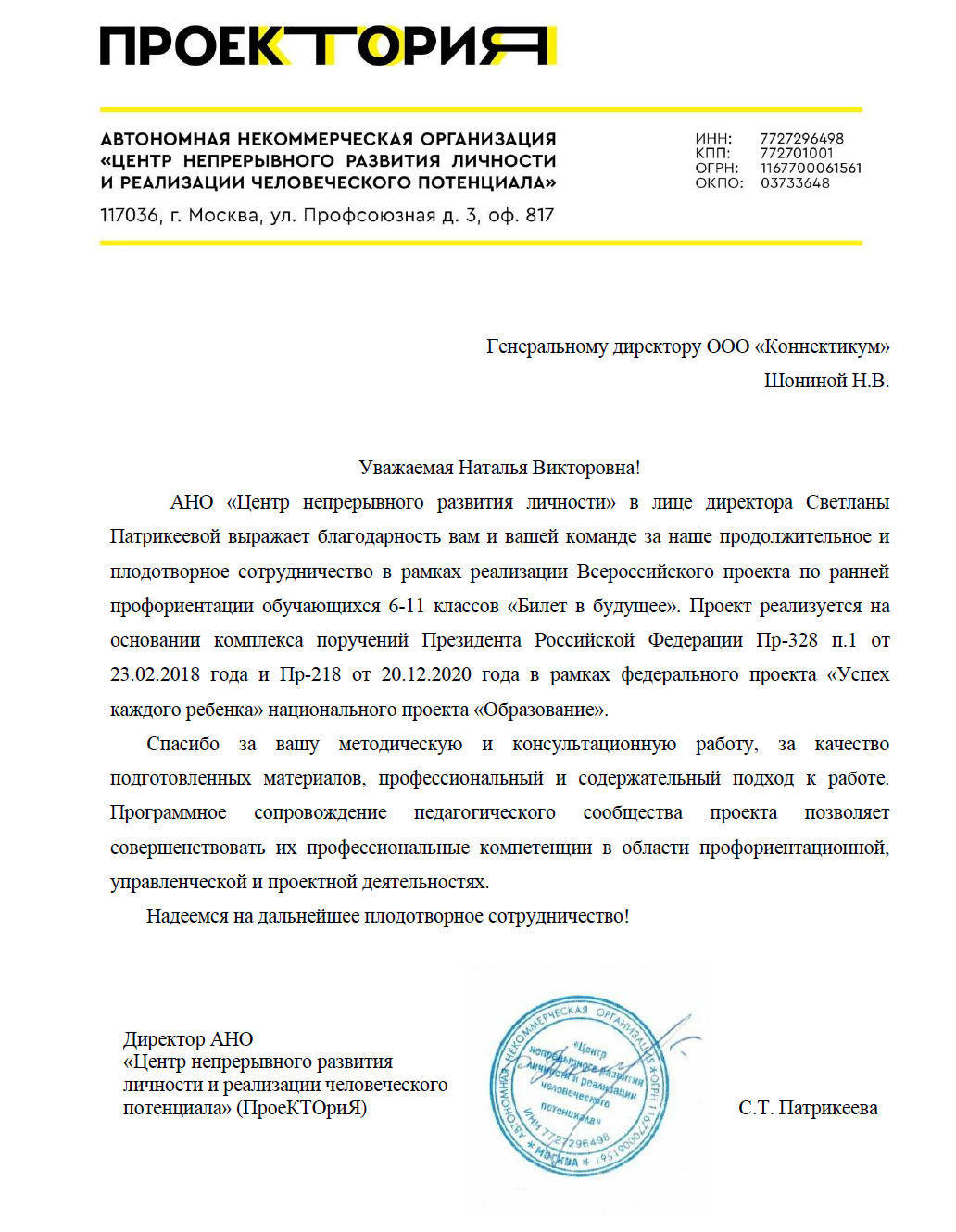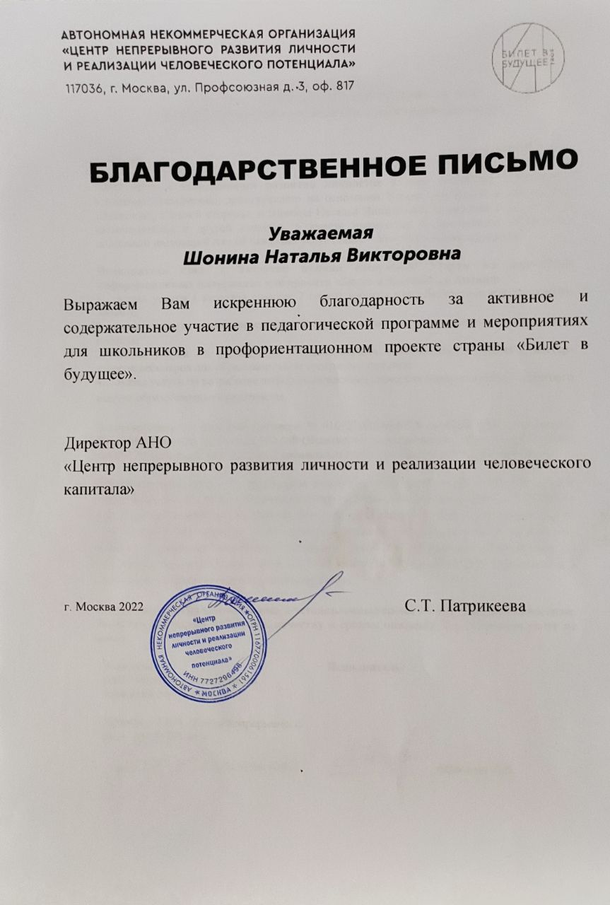 Выражаем благодарность вам и вашей команде за наше продолжительное и плодотворное сотрудничество в рамках реализации Всероссийского проекта по ранней профориентации обучающихся 6-11 классов «Билет в будущее»...