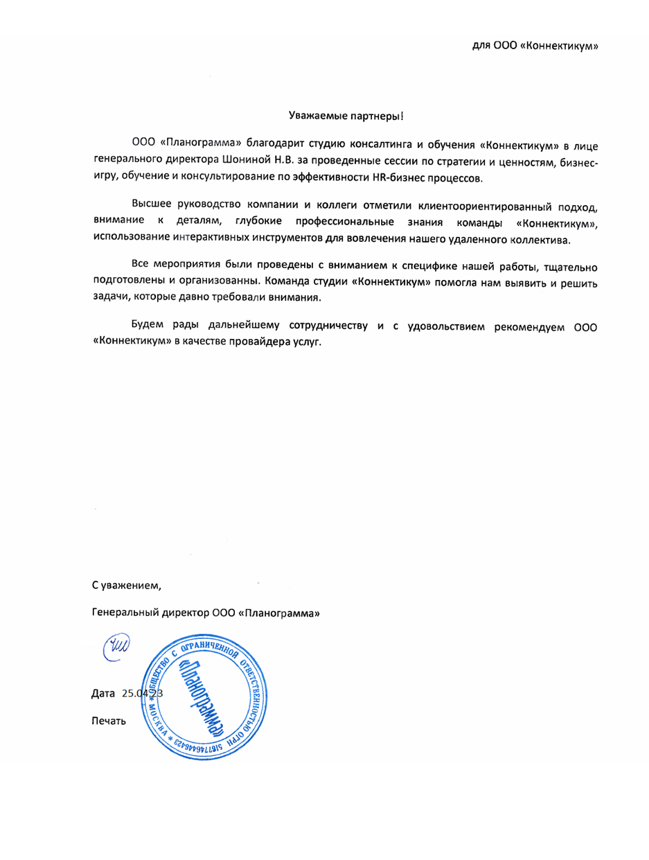 ООО «Планограмма» благодарит студию консалтинга и обучения «Коннектикум» в лице генерального директора Шониной Н.В. за проведенные сессии по стратегии и ценностям, бизнес-игру, обучение и консультирование...