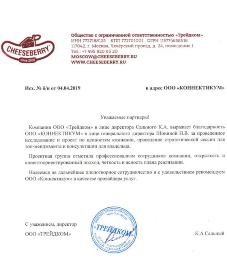 Компания ООО «Трейдком» в лице директора Сального К.А. выражает благодарность ООО Коннектикум за проведенное исследование и проект по ценностям компании, проведение страт. сессии для топ-менеджмента...