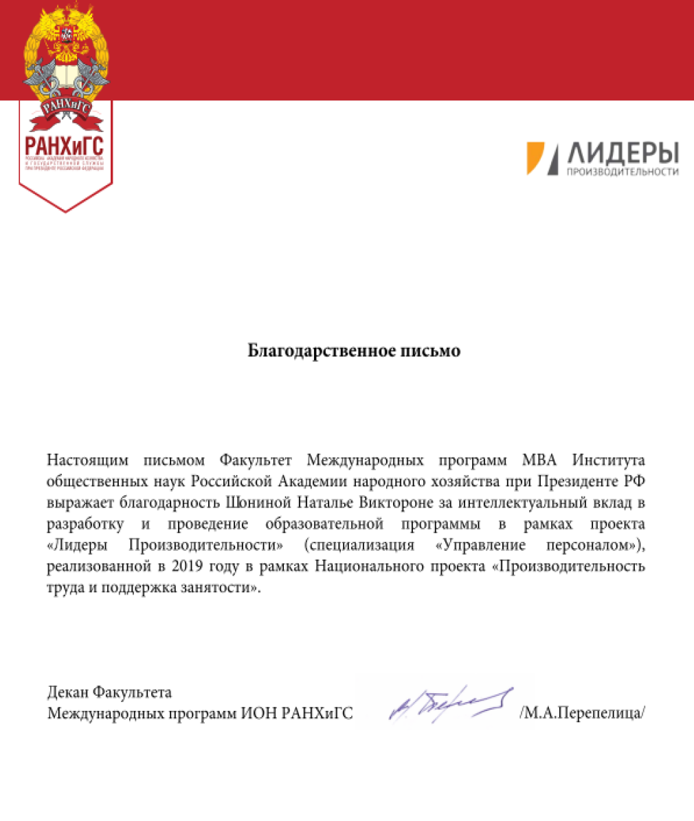 Настоящим письмом Факультет Международных программ MBA Института общественных наук Российской Академии народного хозяйства при Президенте РФ выражает благодарность Шониной Н.В. за интеллектуальный вклад...